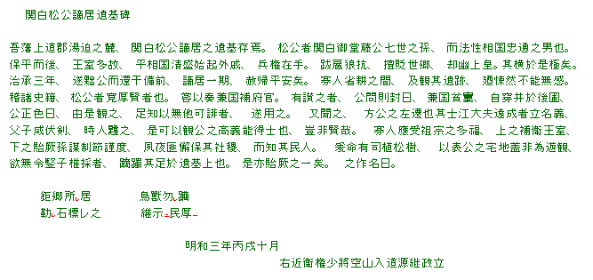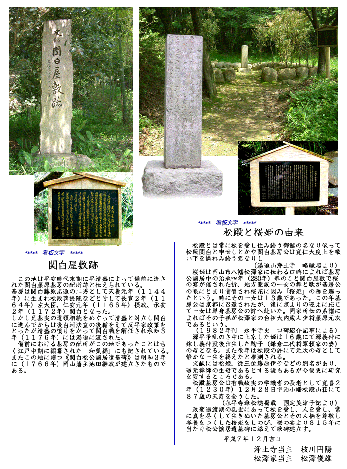 松殿基房が帰京し、不在となってから長年の間放置状態となり荒廃したこの遺跡を見た岡山藩主池田継正公は、ますます荒廃していくことを懸念し、これを防ぐために、明和3年(1766年)、松樹などを植栽して石碑を建てた。